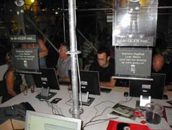 Het volop aanwezige publiek staat in de rij om achter onze publieksterminals plaats te nemen. Vooral om hun mail te checken of spelletjes te spelen. Oké, de flatscreens zijn geil, maar hebben de mensen thuis geen internet? We hebben er een hele taak aan de mensen duidelijk te maken wat een Minirecensie is of soms zelfs het festival zelf. Een licht aangeschoten maar goedmoedig figuur is stomverbaasd: "Is er ook theater dan?" Verder vinden bierende jongens dat we met een aardappel praten en wij vinden ze dan stom. Gelukkig zijn er ook bezoekers die een Minirecensie schrijven of die wat rondsurfen op de site. Nog niet veel festivalscores, men kijkt de kat nog even uit de boom.