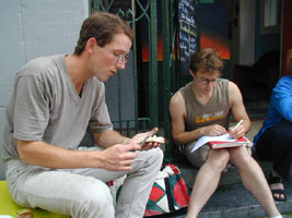 Maar zie daar, wat een verrassing; Matthieu Turker (eerste jaars theatervormgeving aan de Rietvelt Academie Amsterdam) laat zich niet uit het veld slaan. Hij komt gewoon toch! En zo ontspon zich in de zon een ontspannen vormgevingslunchje.